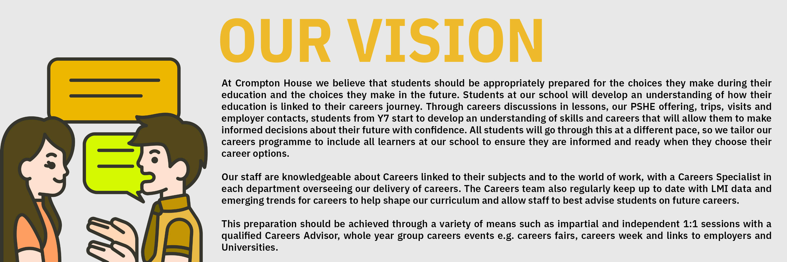 Welcome from our Careers Team! If you’d like to get in touch with us please contact the school on info@cromptonhouse.org with your questions and you’ll be guided to the correct team member.