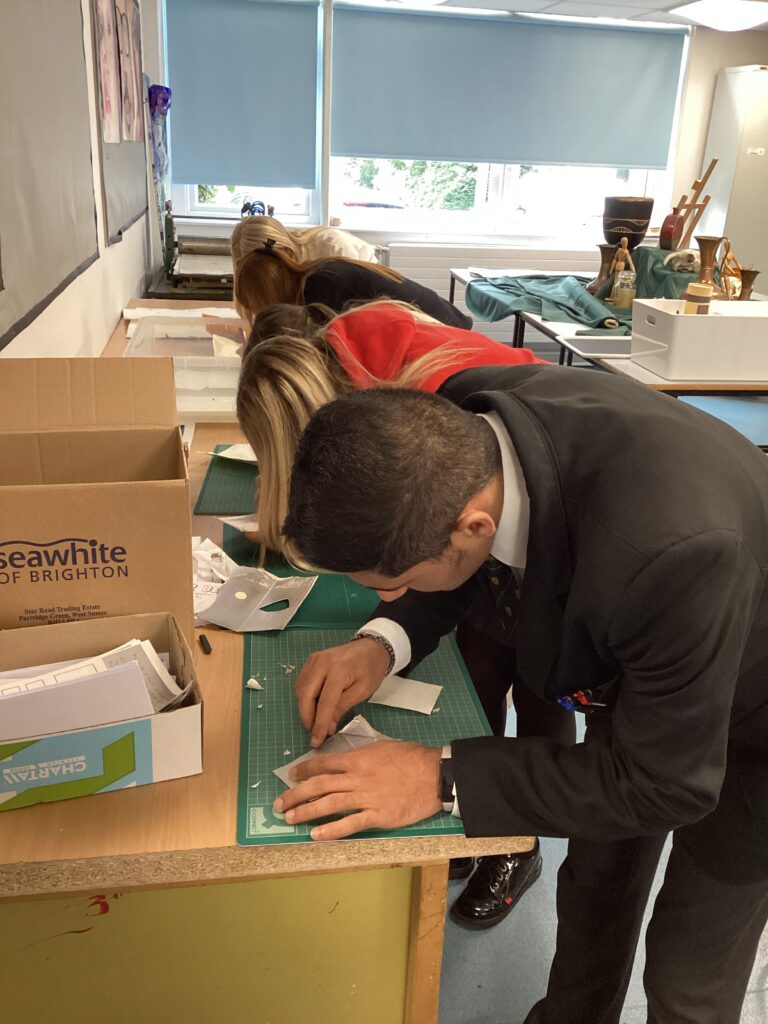 On Tuesday 3rd October our Year 11 students had the opportunity to learn the art technique Intaglio printmaking. Students began by cutting packaging to find the perfect shiny material which would be marked, inked, and rolled onto paper. As you can see below students created some fabulous pieces of art created using this technique.